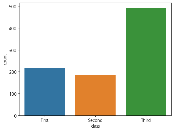 sns.countplot(x="class", data=titanic)